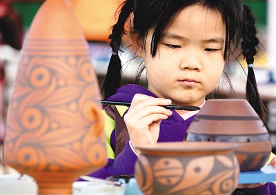 圖為一名小朋友在遺址公園考古體驗園繪制紋飾。