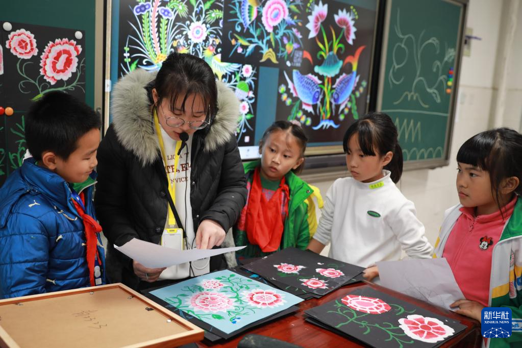 11月17日,在湖南省湘西土家族苗族自治州吉首大學師范學院附屬小學教育集團溶江小學,老師在課後服務中對學生的苗畫作業進行指導。 今年秋季開學以來,各地積極落實“雙減”政策,學校利用課外時間開展內容豐富、形式多樣的特色文體社團活動,豐富學生校園生活,促進學生健康成長。新華社發(彭彪攝)