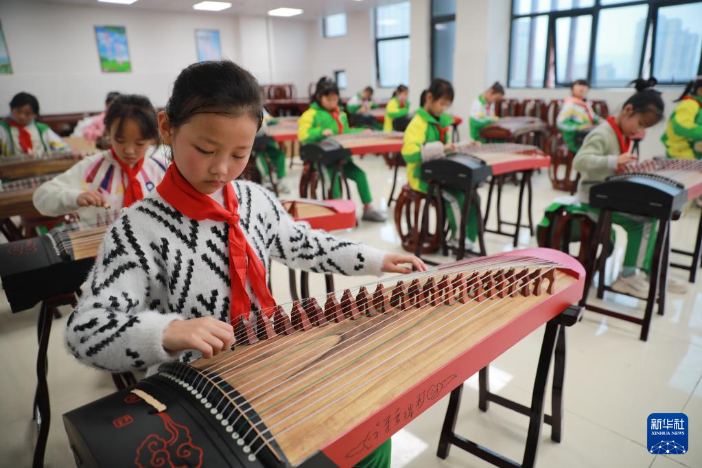 11月17日,在湖南省湘西土家族苗族自治州吉首大學師范學院附屬小學教育集團溶江小學,學生在課後服務中參加古箏學習。新華社發(彭彪攝)