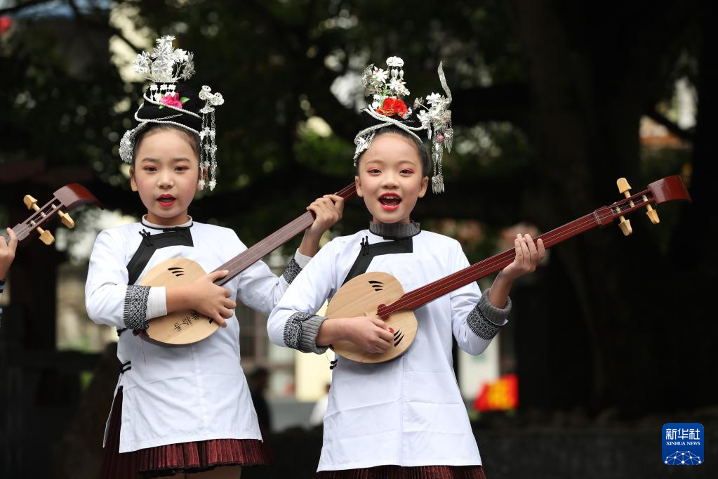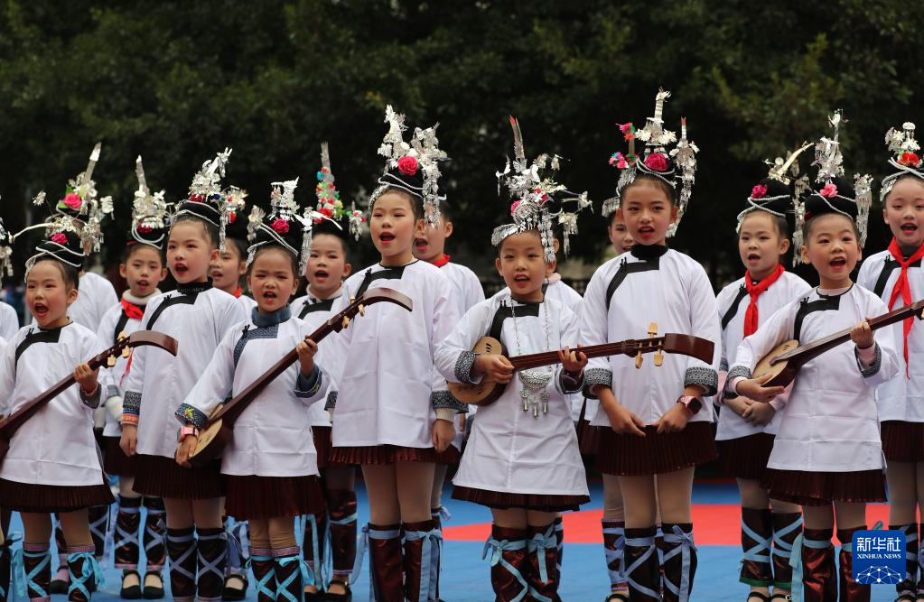11月17日,在貴州省黔東南苗族侗族自治州榕江縣古州鎮車民小學,侗族學生在演唱侗族琵琶歌。新華社發(李長華攝)