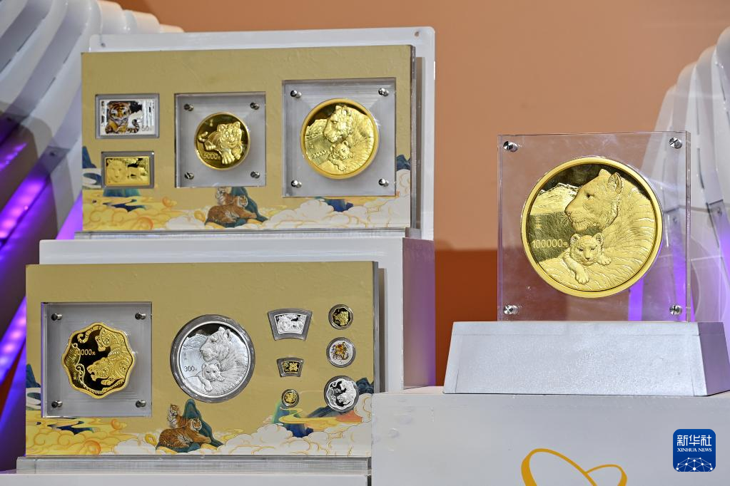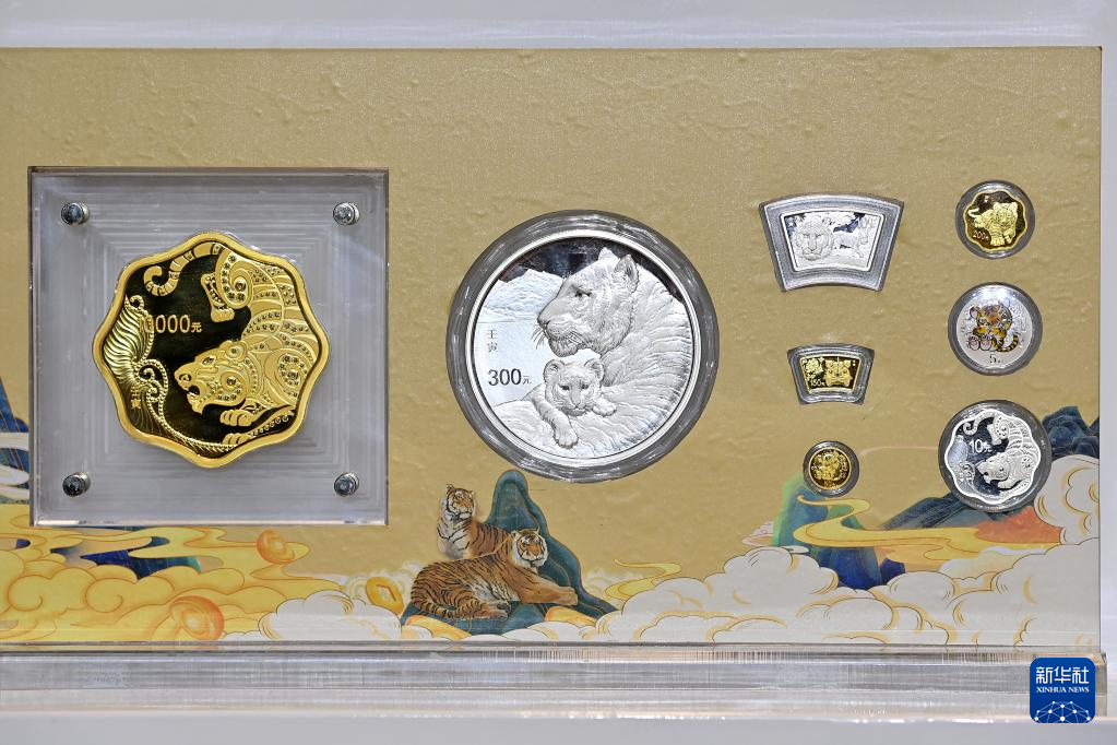 這是11月18日在北京舉行的2022中國壬寅(虎)年金銀紀念幣品鑒會上拍攝的紀念幣。新華社記者 李鑫 攝