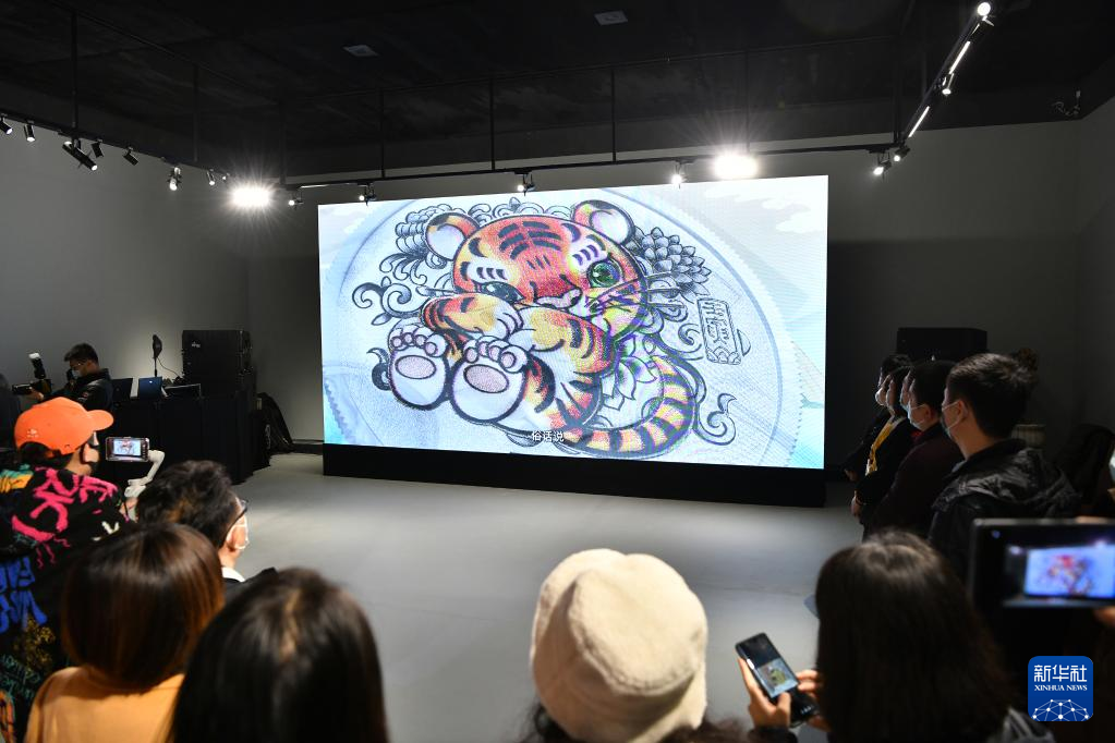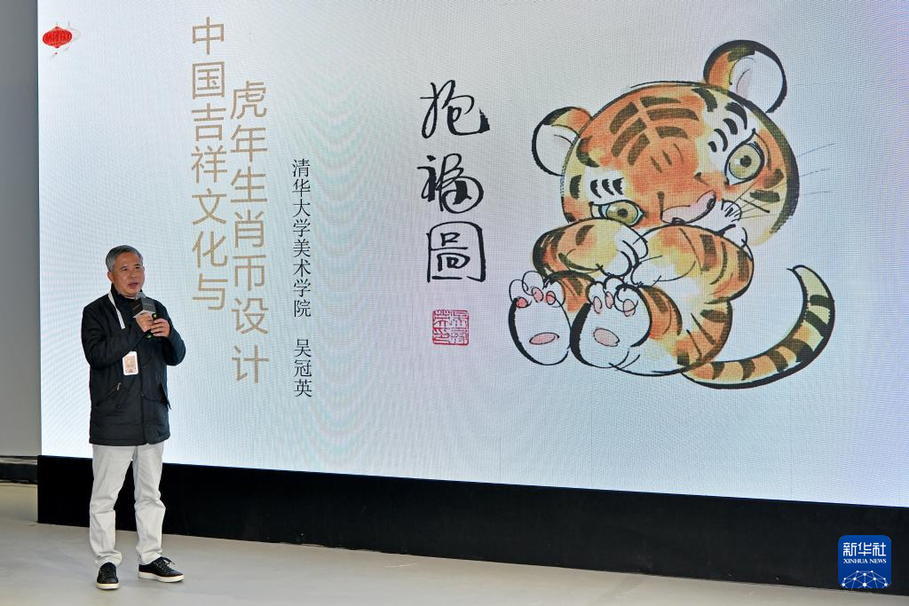 11月18日,2022中國壬寅(虎)年金銀紀念幣背面圖案設計者之一、清華美院教授吳冠英介紹紀念幣設計過程。新華社記者 李鑫 攝