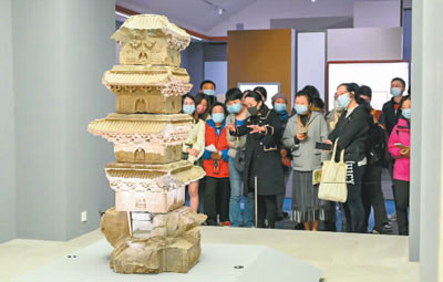 策展人徐穎為觀眾介紹北宋靈峰寺石塔。葉賓得攝