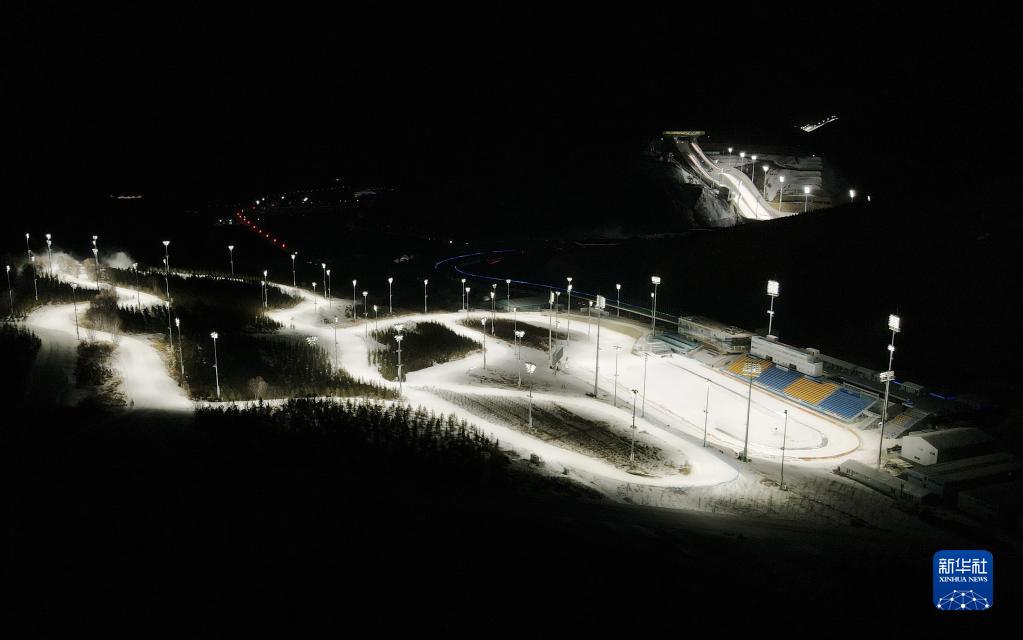 這是2021年12月30日拍攝的張家口賽區國家越野滑雪中心(下)和國家跳臺滑雪中心夜景(無人機照片)。新華社記者 楊世堯 攝
