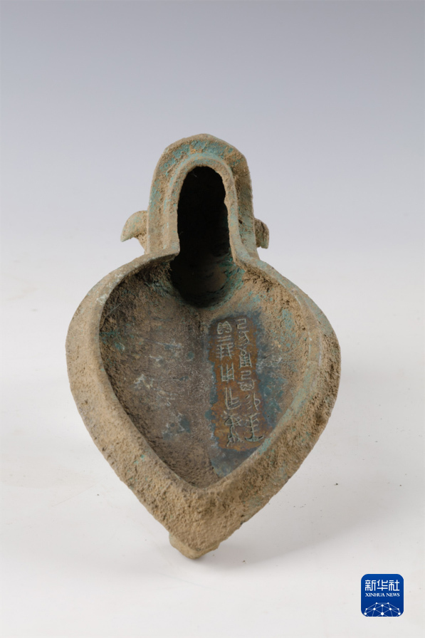 這是邵家棚遺址出土的青銅觥蓋,內壁上有銘文12字(資料照片)。新華社發(安陽市文物考古研究所供圖)