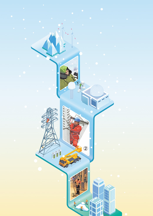 再看張濤,脫下身上的棉衣,穿著全套帶電作業屏蔽服,背上工具包,輕松靈活地沿著軟梯爬到了導線損傷處。“導線斷股程度不一樣,要按照損傷程度採取不同的方式進行處理。”在地面提供協助的工友向記者解釋。接近零攝氏度的氣溫下,張濤和工友們一幹就是兩小時,斷股處才修補完畢。