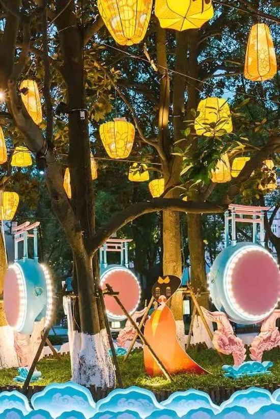 唐風門頭、上百中式燈籠、唐朝月舞造型燈光、超萌Q版唐人IP形象藝術裝置……