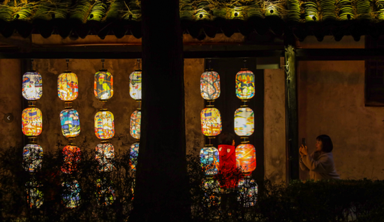 期間,楓涇古鎮南大街獨有的街道布局中,喜慶斑斕的燈光秀展示著“上海剪紙古鎮”活動的精彩作品。