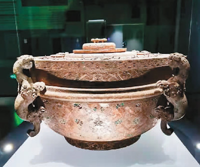 曾國錯金雲紋鑒缶。(記者田豆豆攝)