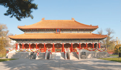 東、西牌樓分列第一院落兩側,均為廡殿頂建築,黃琉璃瓦之下是旋子彩繪。東牌樓叫“禮門”,題有金字“德配天地”;西牌樓叫“義路”,題字“道冠古今”。