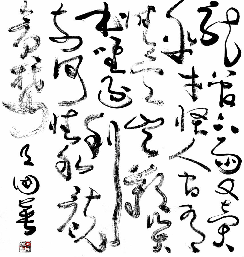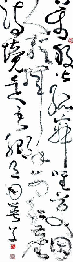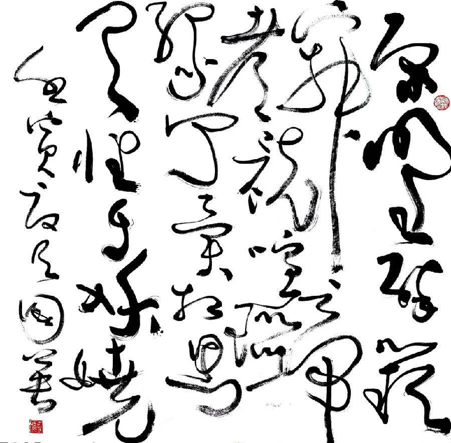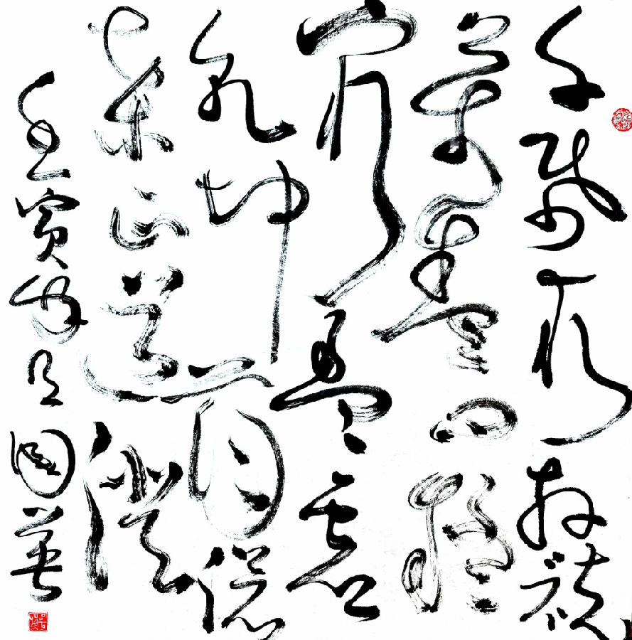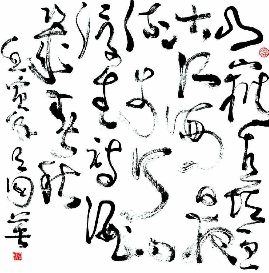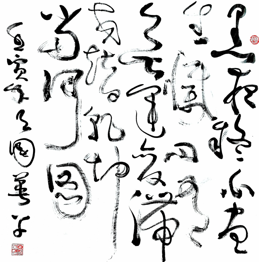 由形而下觀,這問題均與書寫之技法、字法、墨法、章法等直接相關係。那麼,是否從這里入手就可解決書象之節律問題了呢?顯然不是。我們再由形而上觀,這些問題雖“衍生”于書寫之結體、墨法等諸方面,但究其根本在于書者書象之速度、力度、向度與化度,並在這“四度”的綜合作用下,方能實現書象創作的節律美。
