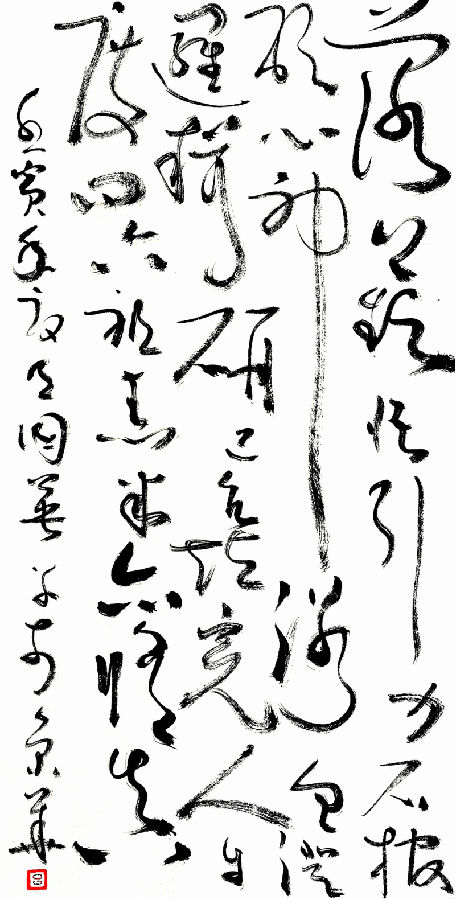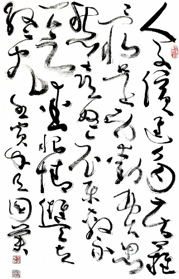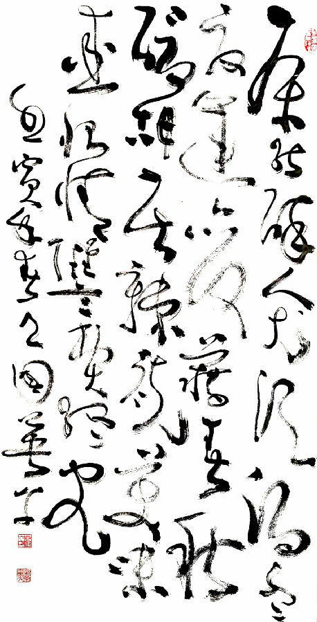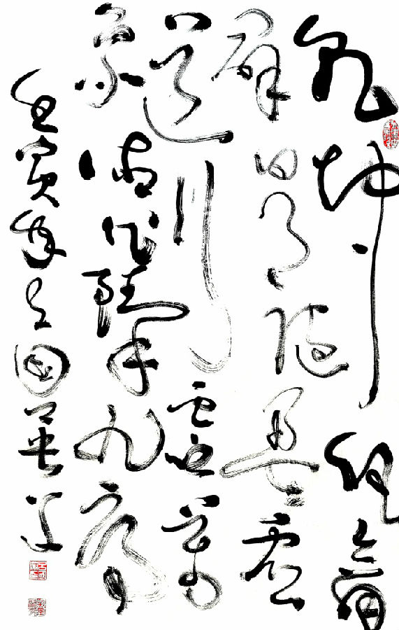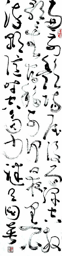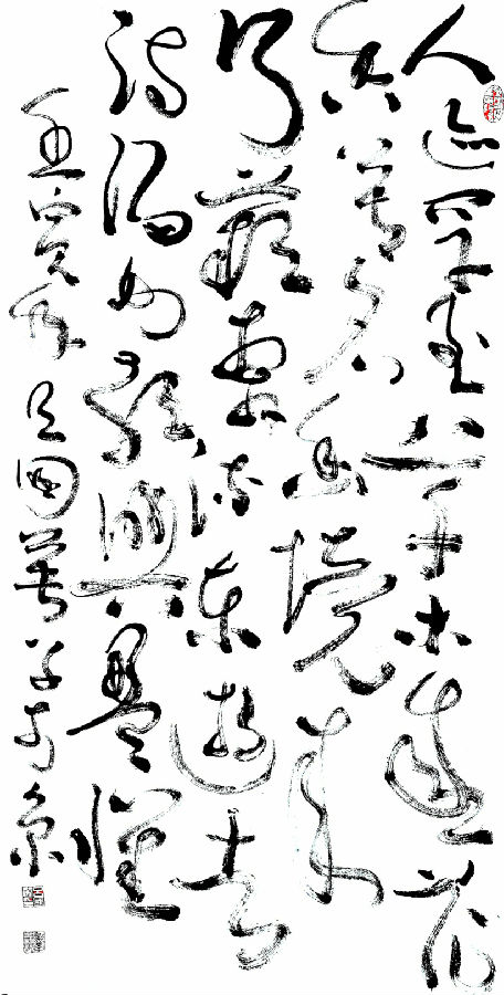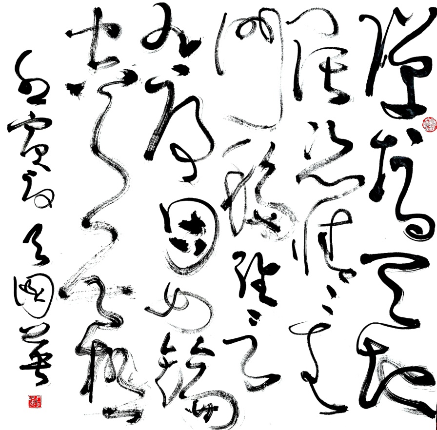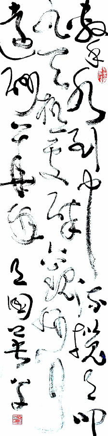 由形而下觀,這問題均與書寫之技法、字法、墨法、章法等直接相關係。那麼,是否從這里入手就可解決書象之節律問題了呢?顯然不是。我們再由形而上觀,這些問題雖“衍生”于書寫之結體、墨法等諸方面,但究其根本在于書者書象之速度、力度、向度與化度,並在這“四度”的綜合作用下,方能實現書象創作的節律美。