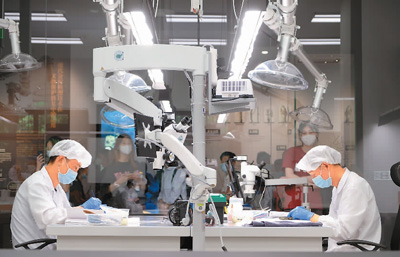 修復中心採用開放型工作方式,觀眾既可以參觀展出的文物,又可以觀看修復的過程。工作人員身著白大褂,有的在操作電腦,有的手持工具伏案修復。觀眾隔著玻璃凝神觀看,一雙雙眼睛盯著修復人員的手指,盯著正在清理和修復的文物,不少人舉起手機和相機拍照。