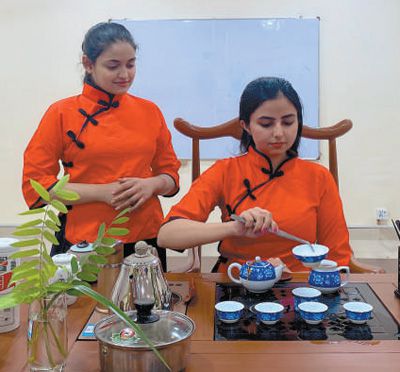 “這是歷史悠久的中國品茶方式,茶湯清香四溢,品嘗時先覺微苦後顯甘甜。”身穿中式紅色斜襟罩衫,巴基斯坦旁遮普大學孔子學院三年級學生謝海爾·貝諾在孔子學院開放日活動上,與同學們為來訪的父母和朋友們奉上一杯中國茶,以中國式的禮儀表達了最熱烈的歡迎。這是貝諾第一次向父母敬茶,她一邊燙壺、泡茶、分杯,一邊與父母分享品茶經驗。中國自古就以禮儀之邦著稱于世,中國茶注重禮儀和情誼,向父母敬茶意味著傳承和回饋。“小時候在家里,總是母親為我們煮茶。如今我很高興自己能用另一種方式向母親表達我的愛與感謝。”她說。