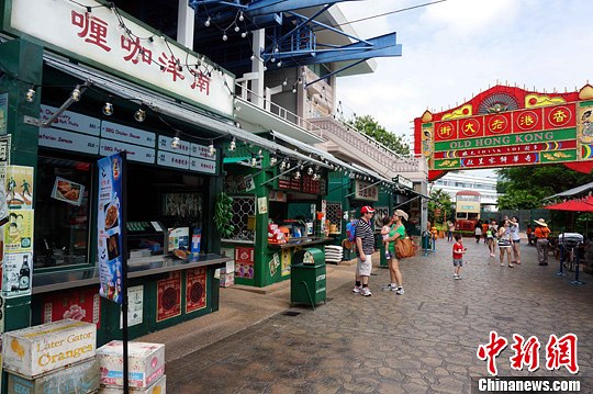 香港海洋公園傾情打造的全新景區“香港老大街”,將五十至七十年代絕跡風貌呈現眼前,遊客恍如走進時光隧道,重遊充滿人情味的舊街和店鋪,登上老爺電車,逐一品嘗經典港式小吃,更有各款似曾相識的懷舊精品。中新社發 洪少葵 攝