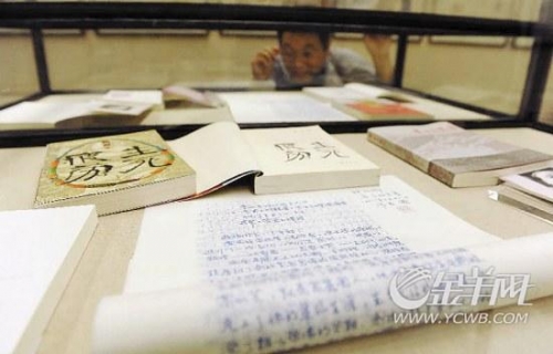 2012年10月25日,參觀者在觀看莫言手稿及作品簽名本。新華社發