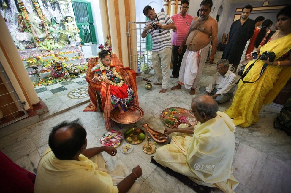 10月12日,在印度加爾各答市的一個社區,被選為杜爾加女神化身的6歲小女孩迪莎參加儀式。當日,印度加爾各答市迎來杜爾加女神節的第三天。在這一天,加爾各答居民挑選8歲以下的女童作為年輕的杜爾加女神化身,對其盛裝打扮,舉行崇拜儀式。新華社記者鄭煥松攝