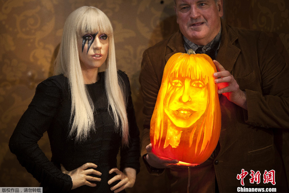 當地時間10月22日,紐約杜莎夫人蠟像館啟動了一項特別的萬聖節南瓜雕刻活動,雕刻師對著Lady Gaga的蠟像在南瓜上雕刻出栩栩如生的人物。