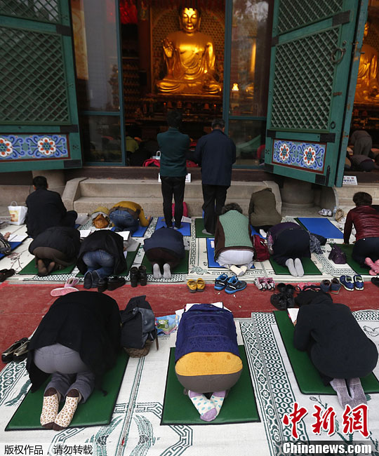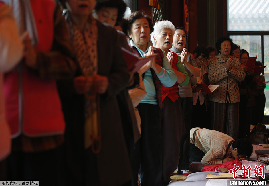 當地時間11月6日,韓國高考考生家長在首爾曹溪寺內為孩子祈禱。每年韓國約有65萬名高中畢業生要參加統一的學習能力傾向測驗,也就是大學入學考試。