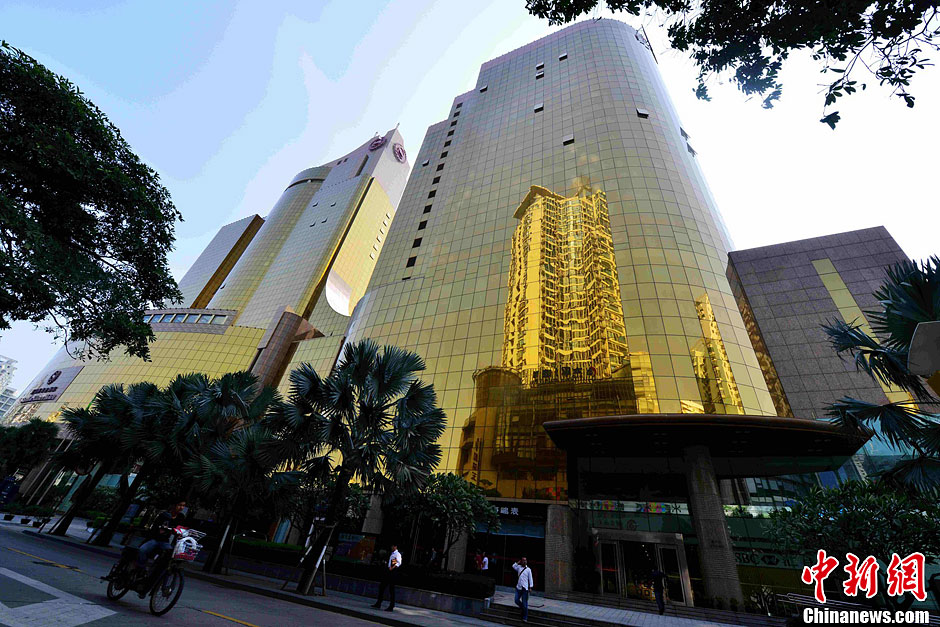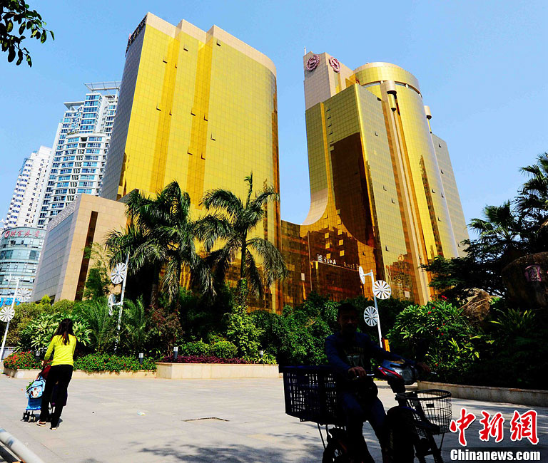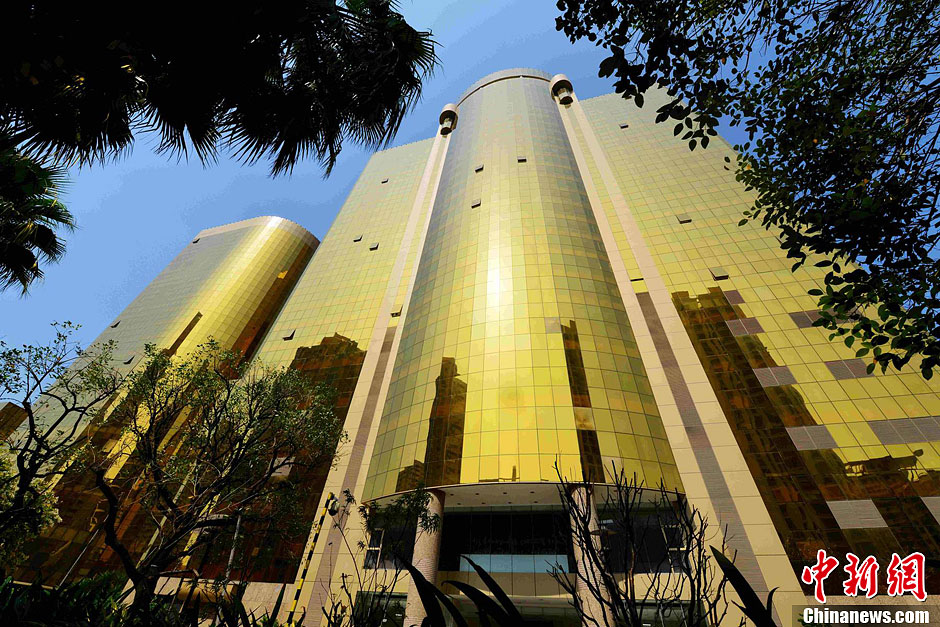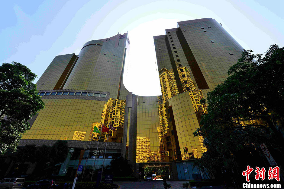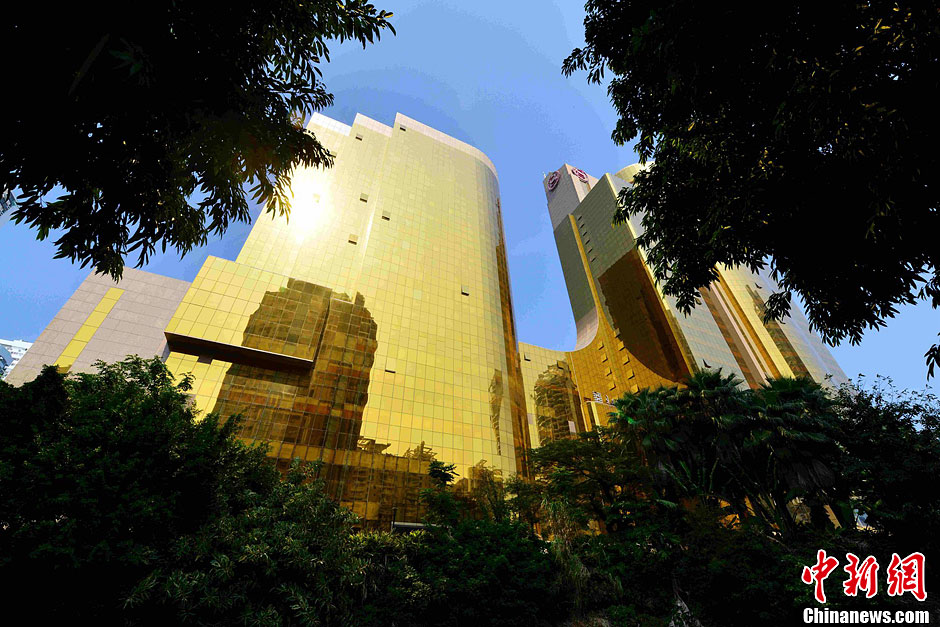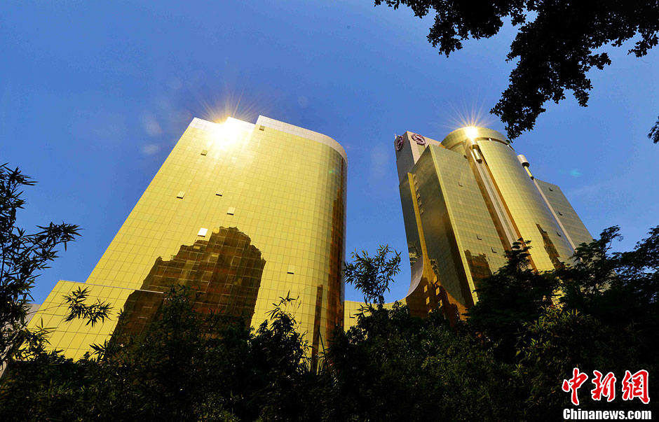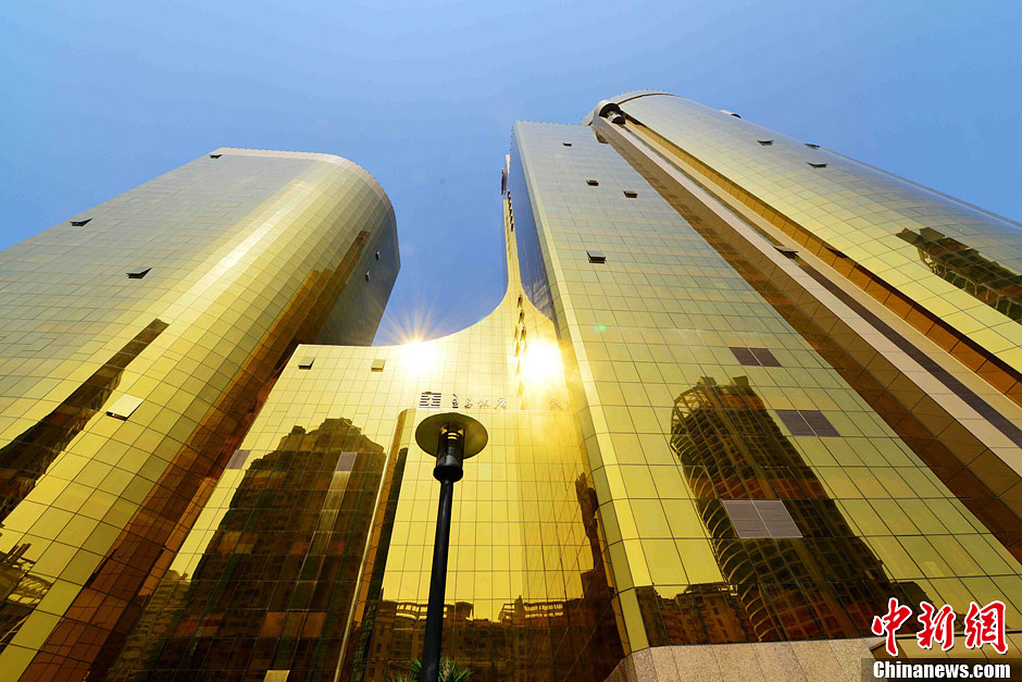 11月7日,廈門市區兩幢外觀被黃色玻璃裝潢的連體建築在陽光的照射下金光閃閃。隨著“土豪金”一詞成為網絡熱詞和國內黃色裝潢建築的興起,一些已經建起並投入使用的“土豪金”大樓再次引起大家的關注。張斌 攝