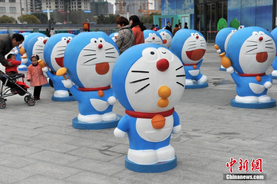 3月3日,20多個各式各樣的哆啦A夢模型亮相福州街頭,吸引許多路人。中新社發 呂明 攝