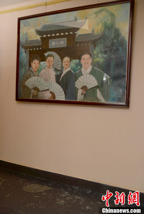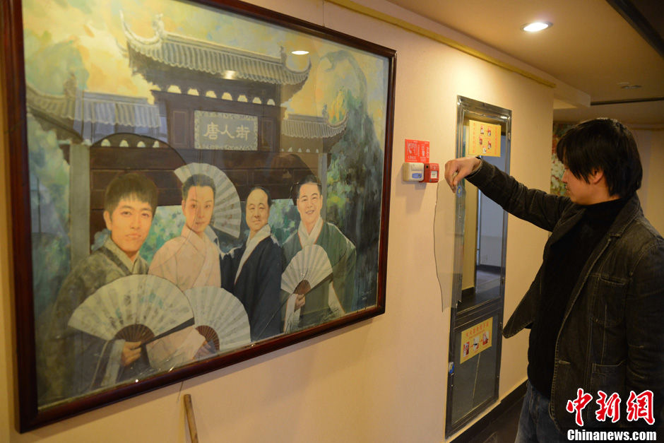 近日,正在長沙展出的《新四大美男圖》外框玻璃被砸碎。展會的工作人員表示,畫框是被一位市民因不滿畫中人物入選而砸壞。