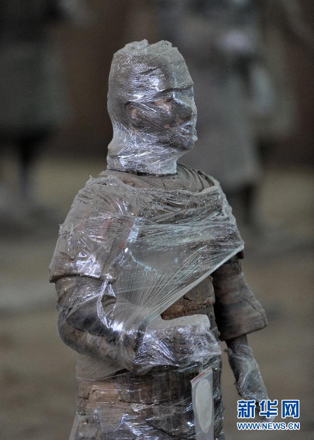 近日,在陜西省秦始皇帝陵博物院兵馬俑一號坑的挖掘修復現場,一些修復中的兵馬俑被工作人員用保鮮膜層層覆蓋。據秦始皇帝陵博物院專家介紹,保鮮膜包裹秦俑是對殘存彩繪的常規保護手段,實踐中一直採用。在秦俑一號坑第三次發掘中出土的秦俑不少還殘存有顏色,但離開了濕潤的地下環境,它們就會因失水而褪色。為保護這些顏色,專家需要對彩繪噴灑保護藥水。保護藥水固定彩繪要經過一定周期,在此期間,專家用保鮮膜包裹秦俑局部以保濕、防塵,直到色彩固定。新華社記者 丁海濤 攝