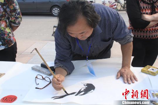 9月29日,海峽兩岸150余名書畫家和書畫愛好者在李苦禪藝術館前共同創作百米書畫長卷,表達對美好生活的熱愛,迎接即將到來的第十屆中國藝術節。圖為,臺灣水墨畫大師李奇茂創作書法作品。 楊曉衛 攝