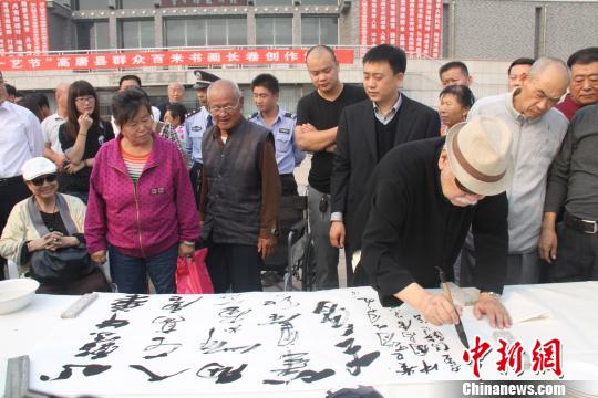 9月29日,海峽兩岸150余名書畫家和書畫愛好者在李苦禪藝術館前共同創作百米書畫長卷,表達對美好生活的熱愛,迎接即將到來的第十屆中國藝術節。圖為百米書畫長卷創作活動現場。 楊曉衛 攝