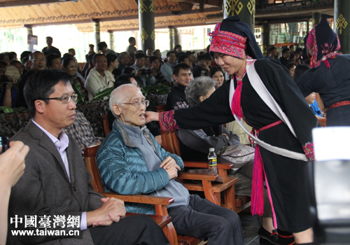 參加表演的黎族少女把“捏耳朵”禮節送給余光中先生。(中國臺灣網 李瑞艷 攝)