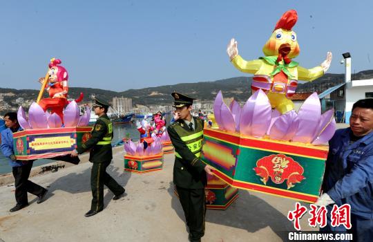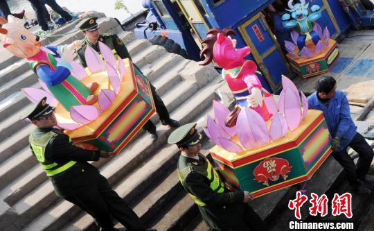 當日,福州連江縣黃岐臺輪停泊點碼頭上,走馬燈、八駿圖、馬年特制花燈、媽祖女神燈、新春喜慶燈等已依次卸下車,擺放整齊。福州連江黃岐邊防派出所官兵,正協助工作人員將贈送馬祖同胞的包括馬年生肖花燈在內的中華傳統文化燈(十二生肖),搬運裝船。