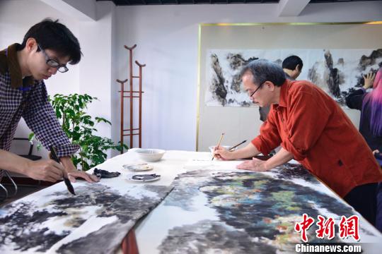 “中華文化在臺灣傳承展”26日在江蘇周莊畫家村昆臺聯合畫院開展,臺灣著名水墨畫家沈以正、羅芳伉儷聯展領銜。圖為兩位畫家為參觀者講解畫作。 顧潔 攝