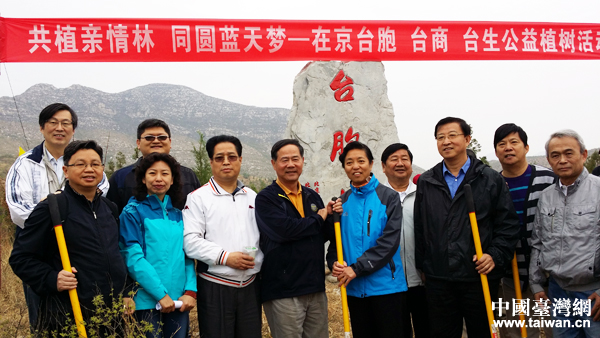 2014年4月19日,北京市臺灣同胞聯誼會、北京市臺資企業協會在房山區南白岱村共同舉辦了第三屆“百個家庭百棵樹”公益植樹活動。圖為兩會領導合影。(中國臺灣網 楊永青 攝)