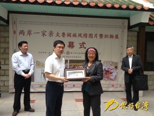 風情展開幕式上,廈門市臺聯與臺灣太魯閣族互贈禮品。(你好臺灣網 圖)
