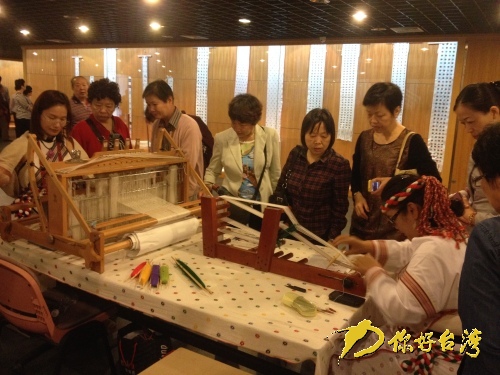 風情展展會現場,觀眾們在參觀臺灣織娘現場織布。(你好臺灣網 圖)