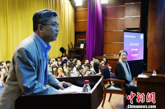 南開大學校長龔克(左一)主持席慕蓉演講會。 張道正 攝