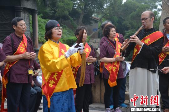 中新網湄洲島5月19日電 (王榕春 林群華)19日,臺灣臺中市龍井區崙仔龍天宮媽祖信眾組團來到“媽祖故里”湄洲島謁祖進香,並在湄洲祖廟天後宮廣場舉行一場別開生面的南音弦管祭天儀式。