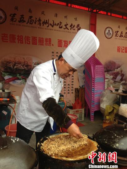康河根告訴中新網記者,漳州小吃歷史悠久,而古早味的面煎粿也有百年歷史,令不少漳州老人回味無窮。言語間,甜香四溢的面煎粿出鍋,在一旁等候著的“吃貨”已經按捺不住。