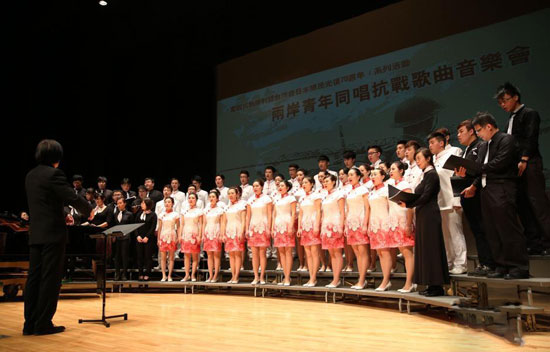 人民網北京4月14日電 據中共中央臺辦、國務院臺辦網站消息,3月29日,第二屆兩岸青年同唱抗戰歌曲演唱會在臺北舉行。此次活動由全球華人紀念抗日協會、臺北市感恩協進會、重慶西南大學共同主辦。重慶西南大學音樂學院合唱團、臺灣元智大學合唱團及臺北法吉歐利合唱團分別演唱了《望春風》、《雨夜花》、《松花江山》、《在太行山上》、《遊擊隊之歌》,共同演唱了《大刀進行曲》、《畢業歌》等著名歌曲。開展兩岸青年同唱抗戰歌曲活動,旨在紀念當年為民族生存而犧牲的同胞,弘揚中華民族攜手同心、共禦外辱的抗戰精神。