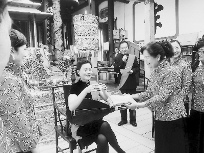 李白燕一行高水準的教學和敬業精神也深深打動了臺灣的學員們,課程結束時他們已經難舍難分。從此,通過電話和微信,相隔海峽兩岸的師生們聯係從未中斷,借助錄音錄像帶等,學習也一直在持續。2012年12月,“福建省南音表演藝術家李白燕收徒儀式”在臺南大天後宮舉行(上圖),12位臺灣弟子按照曲藝界拜師學藝的傳統禮俗正式拜李白燕為師。兩年後,時為福建省勞動模范的李白燕入臺參訪,學生們聞訊從島內四面八方趕往她下榻的酒店,既為看望恩師也是抓住難得的機會當面求教。
