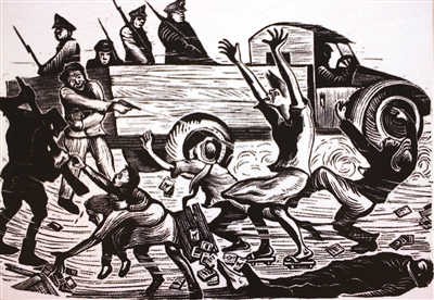 1947年上海《文匯報》發表木刻作品《恐怖的檢查——臺灣二·二八事件》聲援臺灣同胞。