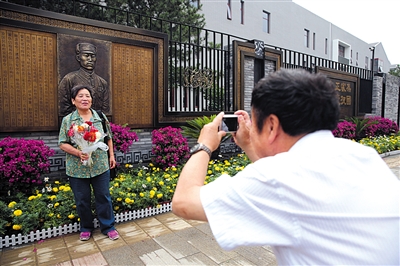 昨日,市民在趙登禹將軍雕塑前留影。
