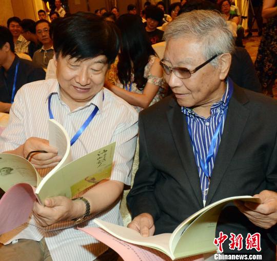 出席該活動啟動儀式的臺灣著名詩人鄭愁予(右)與大陸詩人、《詩刊》雜志社原主編葉延濱交談甚歡。 記者劉可耕 攝