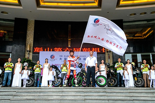 中國臺灣網四川眉山訊 近日,四川省眉山市彭山區舉行了“彭祖文化走四方取水岷江源”出徵儀式,宣告為期8天的“彭祖文化走四方取水岷江源”活動正式開始。祖籍彭山區青龍鎮的臺灣“亞洲車神”陳雙全在開幕儀式上表演了飛車特技。彭山區委書記梁磊為陳雙全及隊員授隊旗。