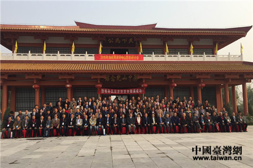 10月17日,參加“2015海峽兩岸孫中山思想研討會”的專家學者在河北省保定市中華孫氏文化園里孫中山紀念館前合影。(中國臺灣網 陳文韜 攝)