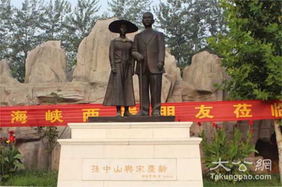 孫中山先生嫡孫女孫穗芳女士在中華孫氏文化園外敬立的孫中山與宋慶齡銅像。 大公網記者李柏濤 攝