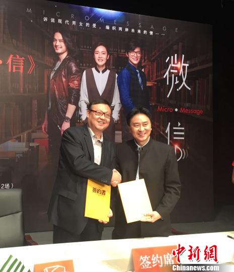 24日上午,由兩岸聯合制作原創音樂劇《微·信》在廈門閩南大戲院發布並開票。這部音樂劇由廈門閩南大戲院攜手臺灣音樂時代劇場聯合制作,圖為雙方負責人士簽約 陳悅 攝