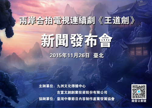 中國臺灣網11月26日訊 兩岸合作拍攝的歷史武俠電視劇《王道劍》26日上午在臺北文創中心舉行新聞發布會。該劇由九洲文化傳播中心、九洲音像出版公司、吉富文創創業投資股份有限公司聯合拍攝。吉富投資控股集團總裁劉吉人、九洲文化傳播中心副主任王傑、吉富文創創業投資股份有限公司董事長嚴守白、顧問周金陵等主辦方代表,編劇劉殿潤等主創人員、海峽兩岸影視界業內人士及兩岸新聞媒體朋友出席了新聞發布會。