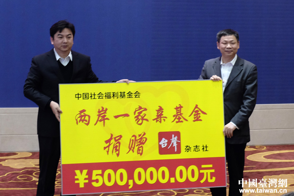 儀式上,中國社會福利基金會兩岸一家親基金執行主任鄧文集代表兩岸一家親基金向臺聲雜志社總編輯竇為龍遞交了50萬元“兩岸一家親 《臺聲》贈鄉親”公益基金展板。