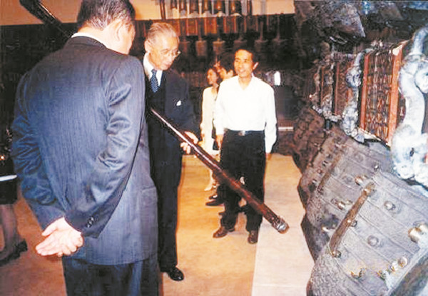 海基會董事長辜振甫觀看“湖北省博物館藏品精華展”,並饒有興趣地試著曾候乙編鐘。